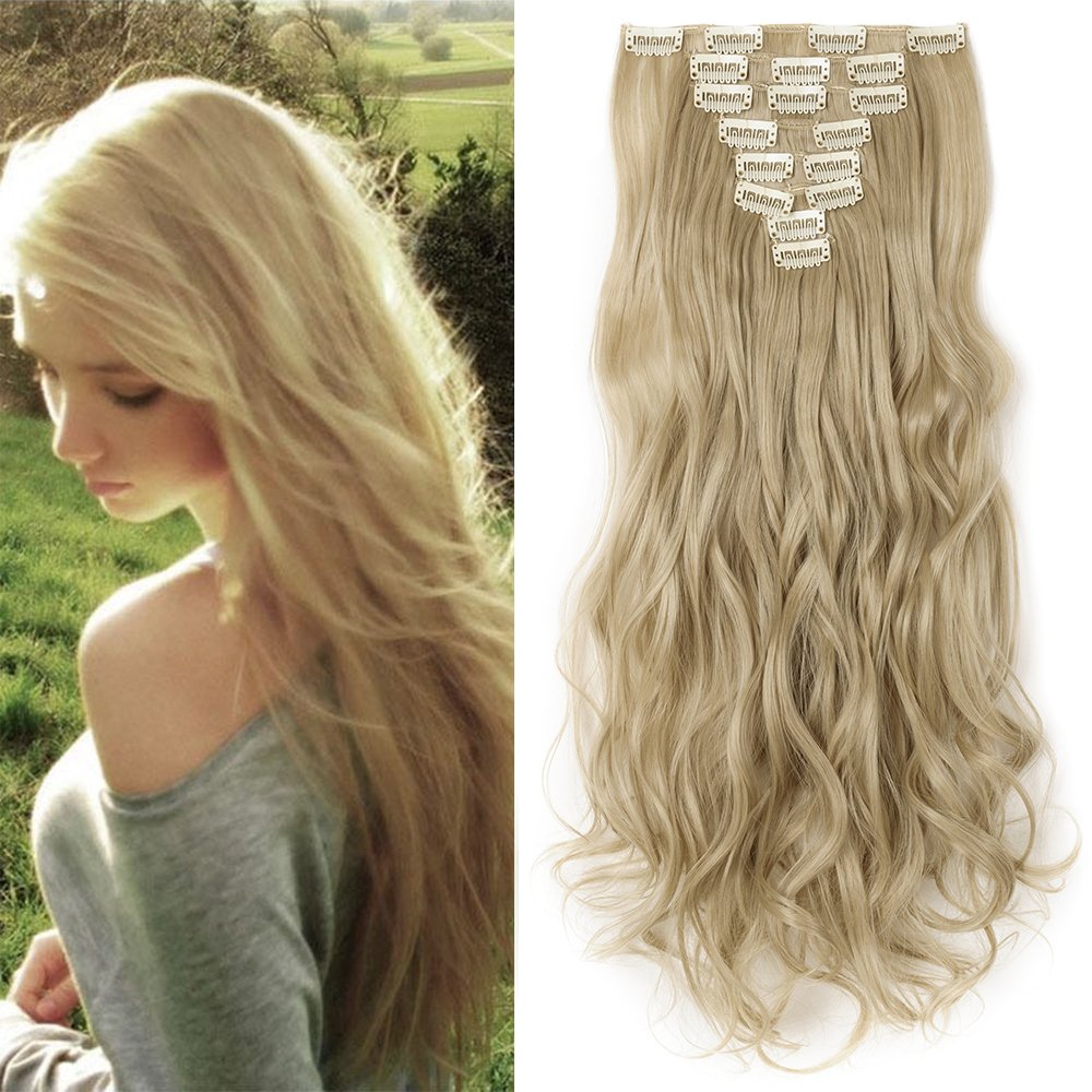 17 Ash Blonde Clip In Hair Extensions Curly Hair Piece 8 Pcs Full Head Set 170 Grams Wavy Long Natural For Women 17 Inch Ash Blonde Mix Bleach