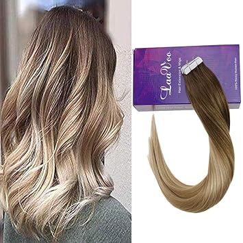 Laavoo 22 Silky Straight Long Hair Tape In Human Hair Extension Balayage Color Highlight Medium
